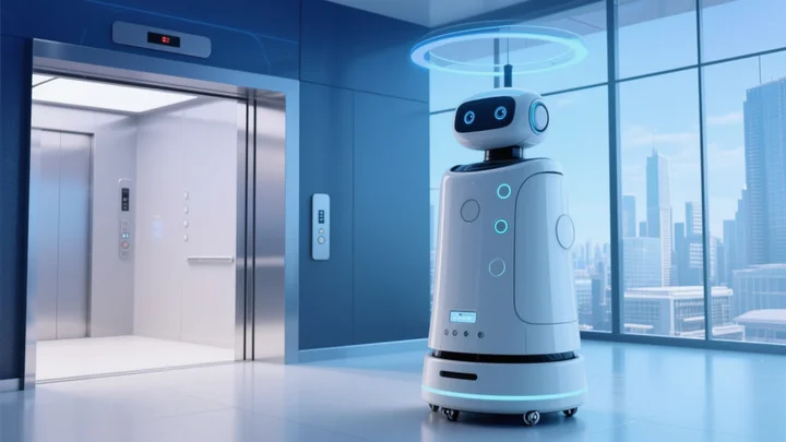 在酒店,送物机器人进入电梯后。机器人的安全系统立即响应,一方面向后台发送电梯异常警报,另一方面启动自身的稳定装置,保持机身平衡。